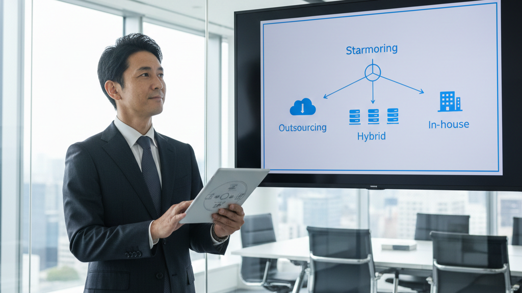 1分で読める情シス担当者が不在の企業向けに、IT体制を構築する3つのモデル(フル外注・ハイブリッド・内製化支援)をコスト・自社IT力・向いている企業像の3軸で比較。従業員50〜200名規模のコスト試算例も提示します。