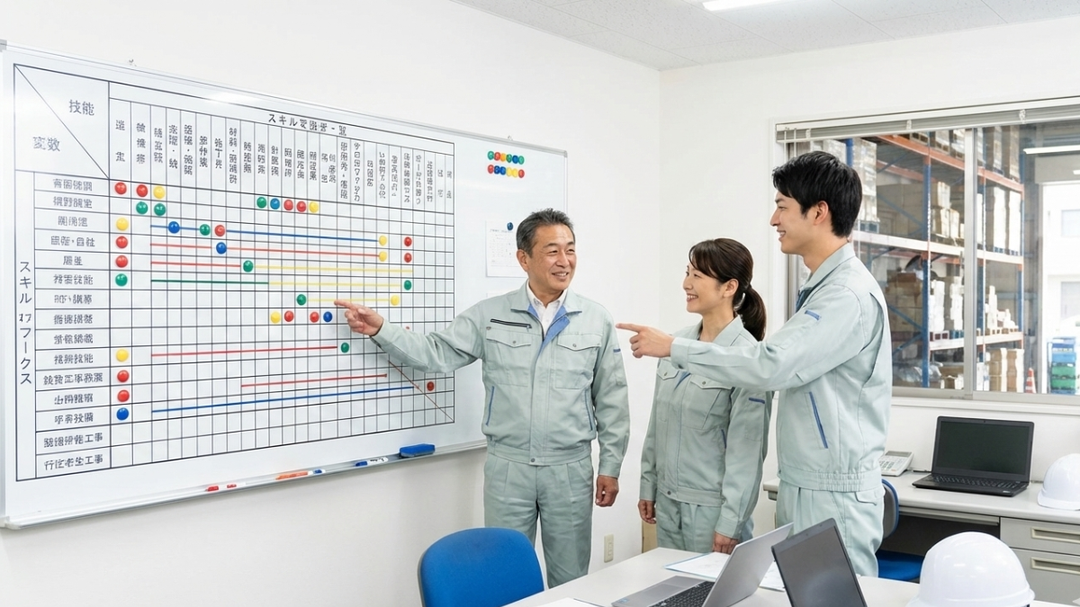 まず、現場で必要なスキルを洗い出し、誰が何をできるかを一覧にします。縦軸に社員名、横軸にスキル項目を並べ、習熟度を3〜4段階で評価します。