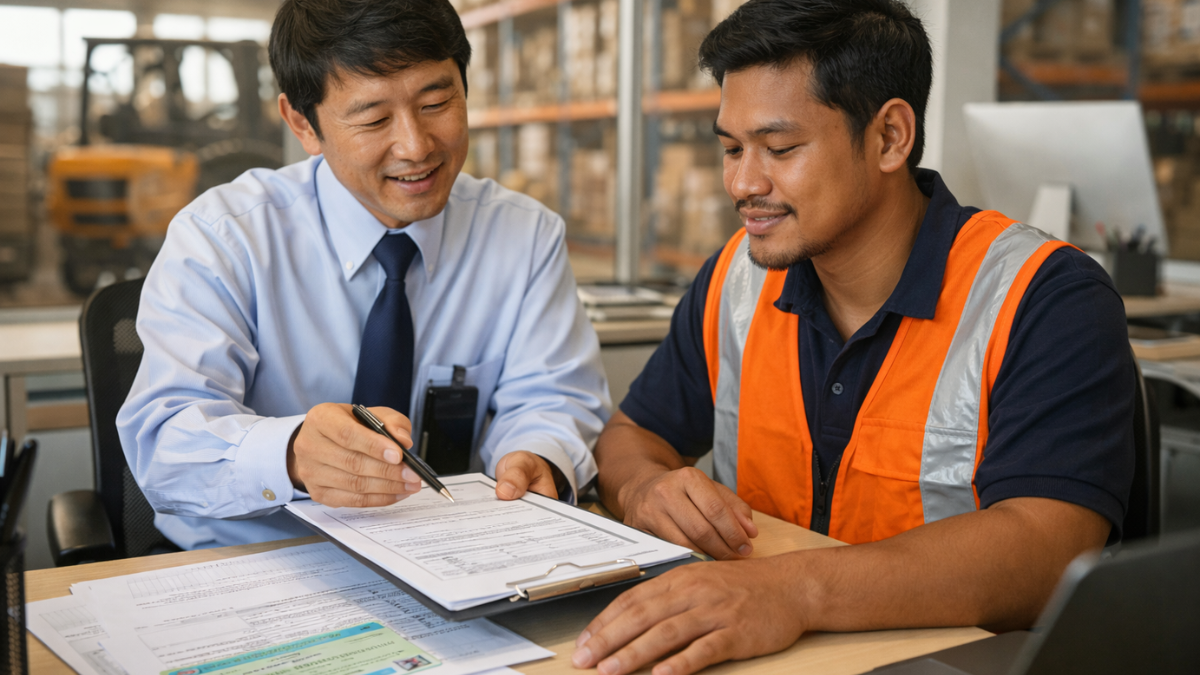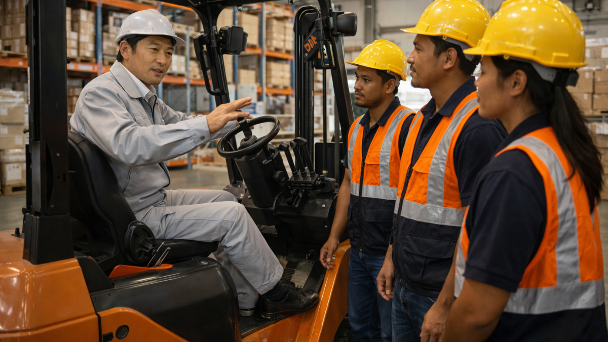 物流倉庫では、安全教育が特に大切です。フォークリフトとの接触事故、重量物の取り扱いによる腰痛、夏場の熱中症など、外国人・日本人を問わずリスクがあります。