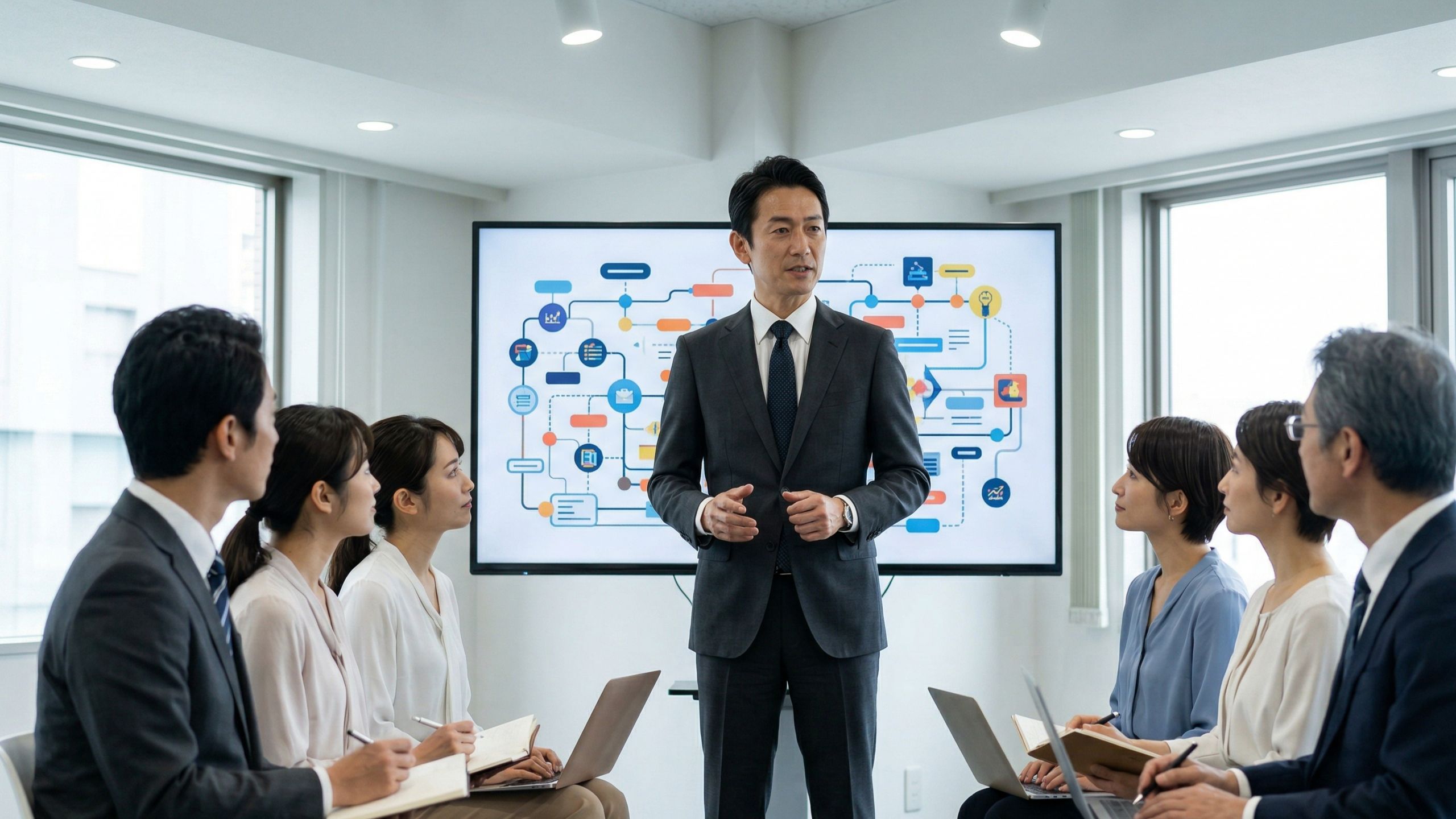 経営層・管理職向けには、DXの必要性と経営戦略への接続、IT投資の判断基準、セキュリティリスクの理解を中心に据えます。技術の詳細ではなく「デジタル技術で何ができるか」「投資対効果をどう判断するか」という経営判断に必要な視座を提供する内容です。半日〜1日の集中型セミナー形式が適しています。