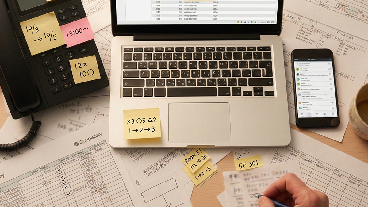 派遣会社に電話して、来週の人数を確認する。 協力会社にメールして、返事を待つ。 Excel を開いて、一人ずつ名前を入力する。 調整が入って、また電話して、Excel を直して…。