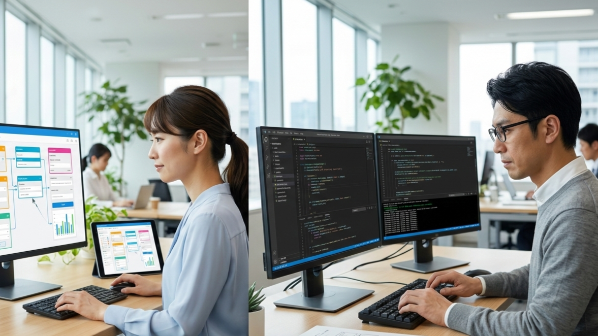 SAP社のレポートでは、LCNC開発プロジェクトの60%以上でIT担当者とビジネスユーザーが連携しているとされています。つまり、実際の企業では「ノーコードかプロコードか」の二択ではなく、両者を組み合わせるハイブリッドアプローチが主流になりつつあります。