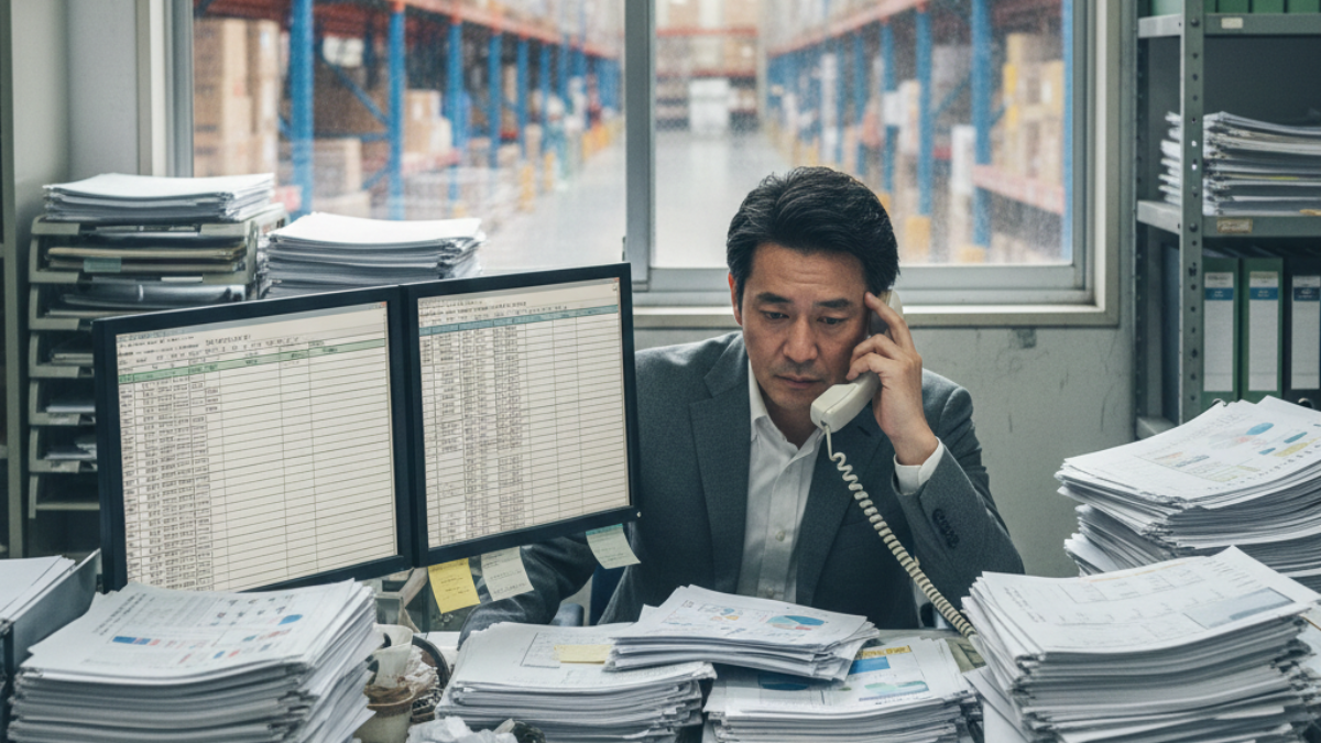 まず挙げられるのが「データを探すのに時間がかかる」という問題です。入出荷実績、在庫情報、作業進捗など、荷主から問い合わせを受ける内容は多岐にわたります。しかし、これらのデータがExcelファイル、紙の帳票、WMS(Warehouse Management System:倉庫管理システム)など複数の場所に分散していると、必要な情報を見つけるだけで10分、20分とかかってしまいます。その間、荷主を待たせることになり、「対応が遅い」という印象を与えかねません。