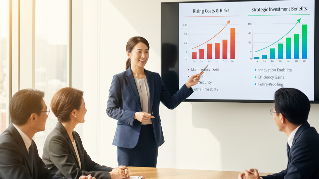 システム刷新の必要性は理解している。しかし、経営層に説明しても「今じゃなくてもいいだろう」「費用対効果がわからない」と言われて止まってしまう——DX推進担当者やIT部門の責任者が最も多く直面する壁のひとつです。本記事では、経営層の判断基準に合わせた説明術と、稟議資料に盛り込むべき要素を解説します。